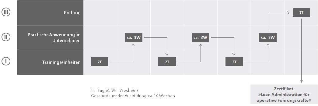 Das Qualifizierungsprogramm besteht aus einer sorgfältig aufeinander abgestimmten, zielgerichteten Kombination von Trainingseinheiten, praktischer Anwendung im Unternehmen, Präsentation und Reflexion der Ergebnisse und Erfahrungen sowie einer Prüfung. Bei positivem Ablegen der Prüfung erhalten Sie das Zertifikat »Lean Administration für operative Führungskräfte«.