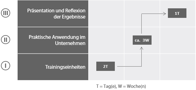 Durch eine sorgfältig aufeinander abgestimmte, zielgerichtete Kombination von Trainingseinheiten, praktischer Anwendung im Unternehmen sowie Präsentation und Reflexion der Ergebnisse und Erfahrungen aus der praktischen Anwendung fördern wir den Lerntransfer in die betriebliche Praxis und die Teilnehmerinnen und Teilnehmer realisieren dabei bereits konkrete Verbesserungen.